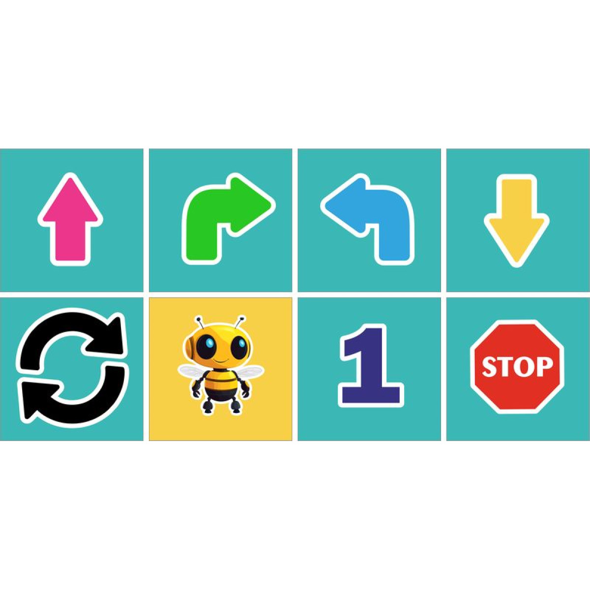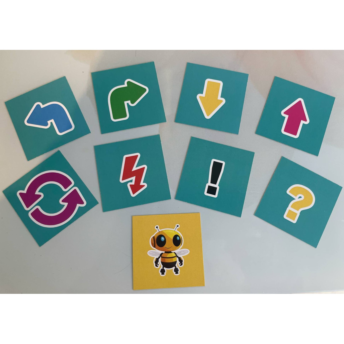 Ez a parancskártya szett tökéletes kiegészítője bármely padlórobotos tanulójátéknak, legyen szó óvodai foglalkozásról, alsós tanóráról vagy otthoni játékos programozásról. A kártyák vizuálisan támogatják a gyerekek algoritmikus gondolkodását, térbeli tájékozódását és logikai feladatmegoldását.